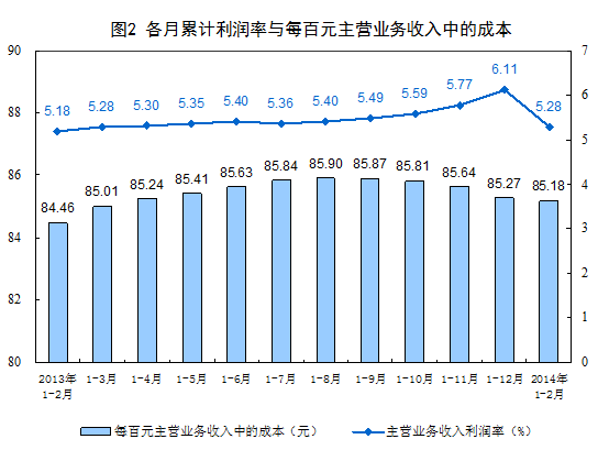 1-2月份,規模以上工業企業主營業務收入利潤率為5.28%,每百元主營業務收入中的成本為85.18元,每百元資產實現的主營業務收入為107.5元,產成品存貨周轉天數為15.4天。